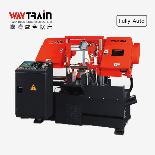 • WH-300HA 雙柱型全自動帶鋸機 全自動系列 彩色觸控螢幕 譯碼器測量送料長度 油壓式鋸帶張力裝置 變頻器控制鋸帶速度 自動鐵屑輸送帶